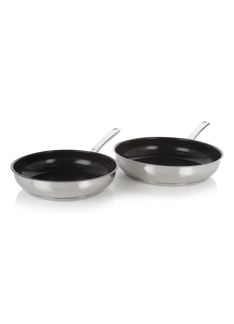 Pannenset van WMF. Deze set bestaat uit twee koekenpannen (24 en 28 cm in diameter) die zijn vervaardigd van Cromargan roestvrij staal 18/10 en zijn voorzien van een keramische antiaanbaklaag. De pannen hebben eveneens een TransTherm-bodem voor een optimale en gelijke warmteverdeling en garing. Geschikt voor gas, inductie, elektrisch en keramisch.